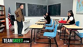 teacher sneaks fishnets classroom fuck with two asian teen students scissoring?