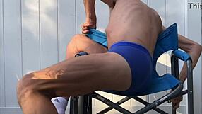 naughty milf sonya rides a bench, showing off big booty while legs shake teasingly