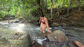 young guy spies naked milf sunbathing on river bank in public
