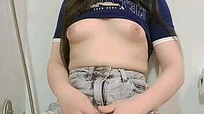 Petite Brunette Teen Fingers Tight Pussy in Bathroom Mirror