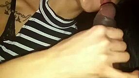Hot Brunette Gives Detailed Blowjob to Hard Cock, Close Up on Natural Tits and Cumshot