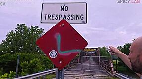 Exhibitionist busty milf bent over fucked doggystyle on abandoned bridge