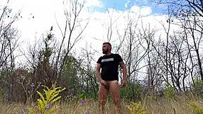 Handsome muscular bodybuilder strokes monster cock naked in public park
