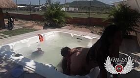 Public sex in in-laws jacuzzi! Blowjob, doggy fuck, and bareback outdoors.