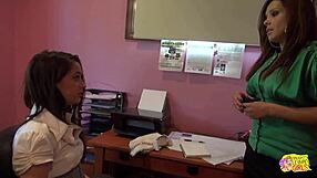 Bossy Brunette Lesbo Forces Lazy Employee into Pussy Lick and Tribbing Climax!